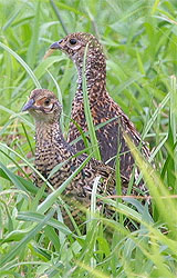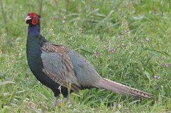 | 特 徴 | 全長オス80cm、メス60cm。オスは顔の赤い肉冠、黒色で緑色光沢のある胸と腹。長い尾羽。メスは黄褐色の体と長い尾羽が特徴。 |