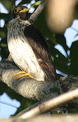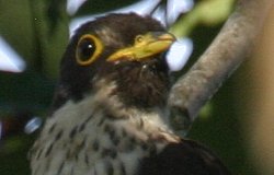 | 特 徴 | 全長32cm。胸から腹のオレンジ色で他のカッコウ類と区別できる。小型のタカに似ているが、尾羽が長く先端が丸い。嘴は黄色と黒色。 |