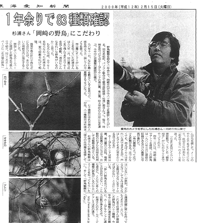 2000.02.15.「岡崎の野鳥」が郷土の日刊紙「東海愛知新聞」で紹介されました。
