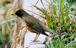 | 特 徴 | 全長23.5cm。オスの頭部は黒味が強く、頭部の黒と胸の橙赤色の境はわかりにくい。メスはオスよりも淡い色でのどにある白い縦斑が特徴。 |