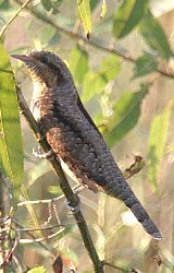 | 特 徴 | 全長17.5cm。体は褐色と黒、灰色の複雑な斑紋がある一般の鳥のように横枝にとまる事が多い。 |