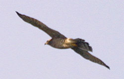 | 特 徴 | 全長49cm。雌雄同色で、上面は褐色。下面は白っぽく褐色の横斑が密になっている。白い喉の中央には黒い線がある。 |