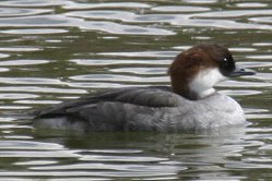 | 特 徴 | 全長39cm(♂は44cm)。頭が茶褐色で頬〜首の前面が白色、体は灰色。雄のエクリプスは雌に似ているが、背が黒い。
