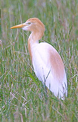 | 特 徴 | 全長50.5cm。夏は頭部から首にかけての橙黄色の羽毛が特徴で、短めで黄色い嘴・黒色の足。冬の羽毛は白色。 |