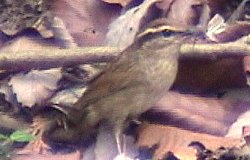 全長11cm。白く長い眉斑と短い尾が特徴で、体の上面は茶褐色、下面は白っぽく見える。